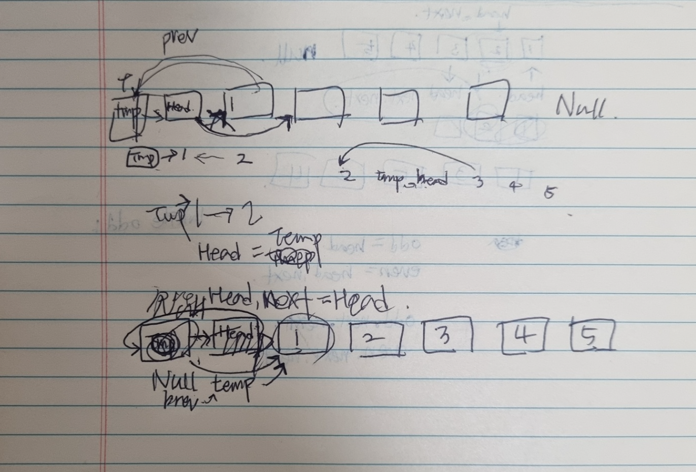 head 노드 뒤에 prev를 두고 한칸씩 prev로 옮긴다... 라고 생각해는데 뭔가 생각대로 되질 않았다.
