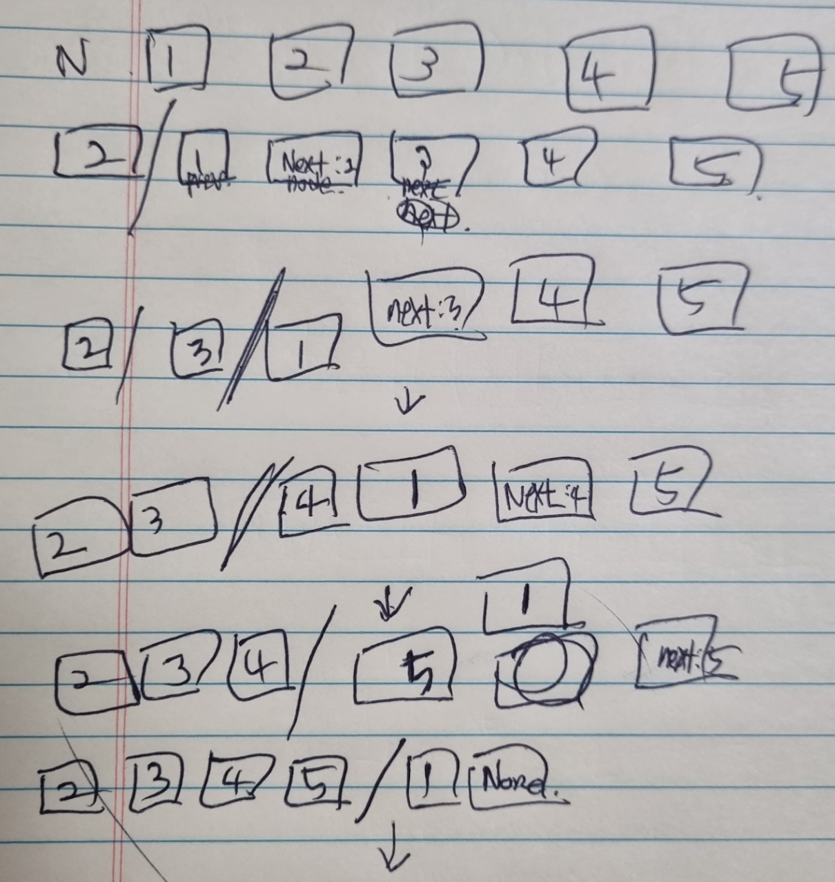 되게 복잡해보이고 헷갈리지만 그림을 그려서 한단계씩 나아가다보면 결국 맨 앞의 node를 하나씩 뒤로 옮겨주는 과정일 뿐이다.