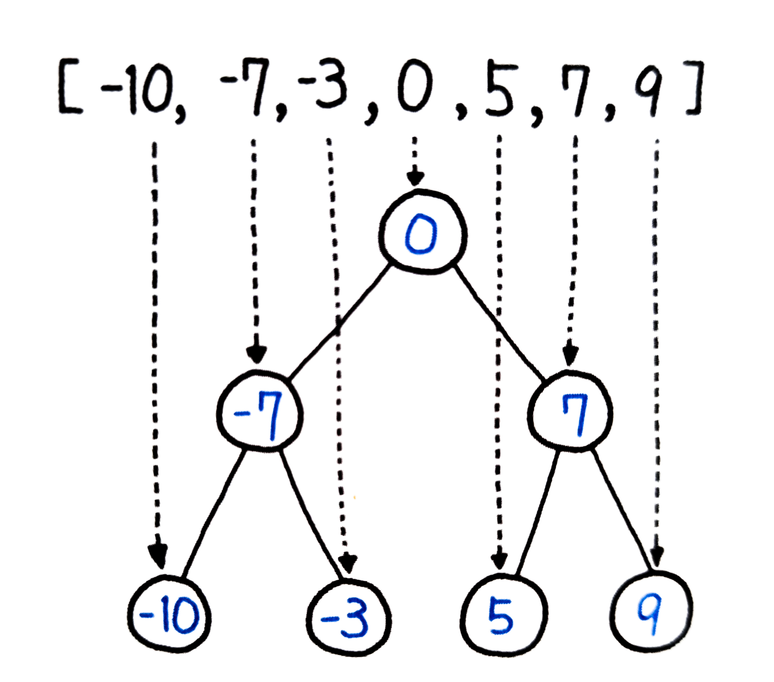 첫번째로 주어진 예시를 가지고 생각해보면, [-10,-3,0,5,9]의 길이인 5를 절반으로 쪼개면 2 ( // 연산자로 소수점자리는 버린다) 가 나온다. 이 mid를 인덱스로 가지고 있는 값이 부모 노드가 된다. 그럼 왼쪽과 오른쪽 노드는 반으로 쪼개고 남은 나머지 왼쪽 배열과 오른쪽 배열이 될 것이다.