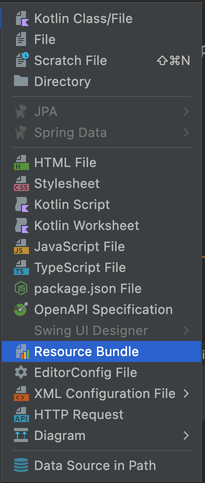 타입은 Resource Bundle로 지정해주고 파일 형식을 지정해주지 않으면 .properties로 생성되므로 .yml로 만들고자한다면 파일명에 .yml을 붙여주거나, 생성 후에 바꿔주자.