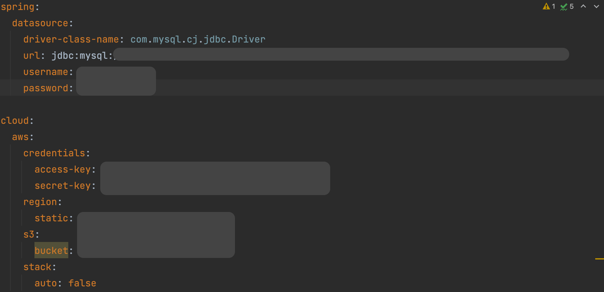 application.yml은 설정파일로 DB의 URL, username, password가 그대로 노출되어있고, S3의 key 역시도 노출되어있다.