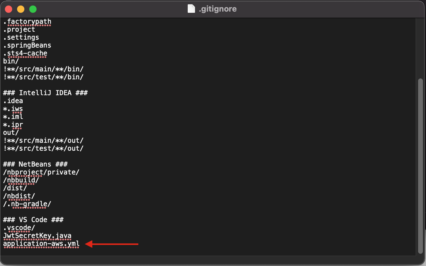.gitignore파일을 찾았다면 우리가 추가하고자 하는 application-aws.yml을 적어주고 저장해주자.
