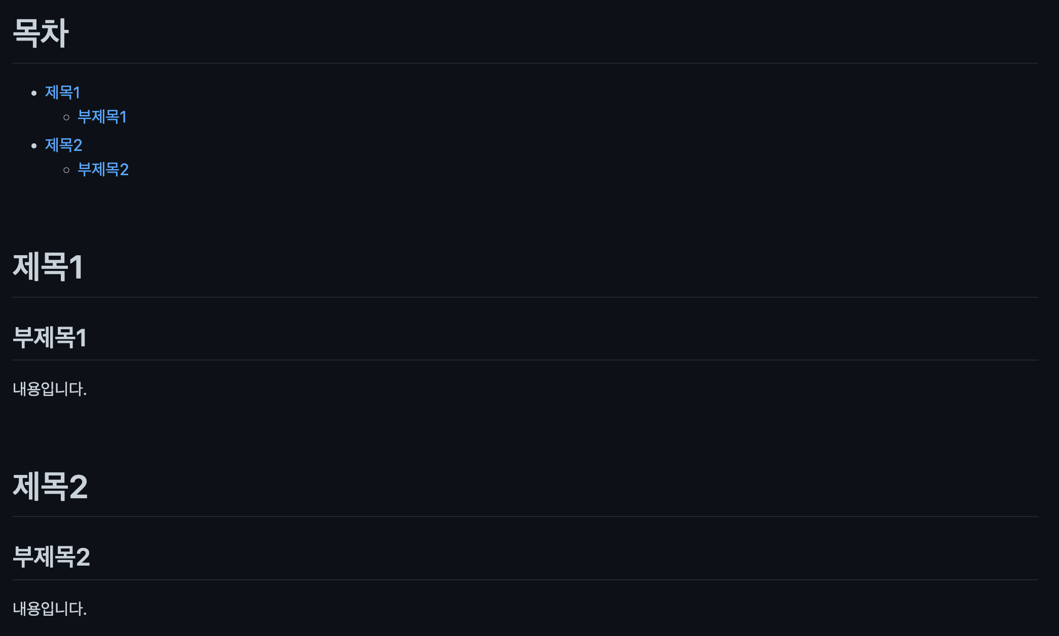 마크다운에서 목차는 헤딩태그(#)로 되어있는 항목을 링크걸 수 있다.