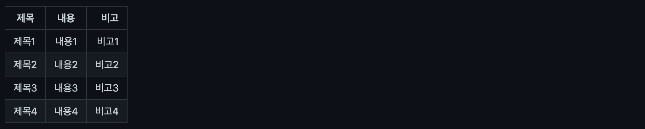 표의 헤더(<th>)는 3개 이상의 하이픈(-)으로 구분해주고, 콜론(:)으로 셀(행/열)의 내용을 정렬해줄 수 있다.