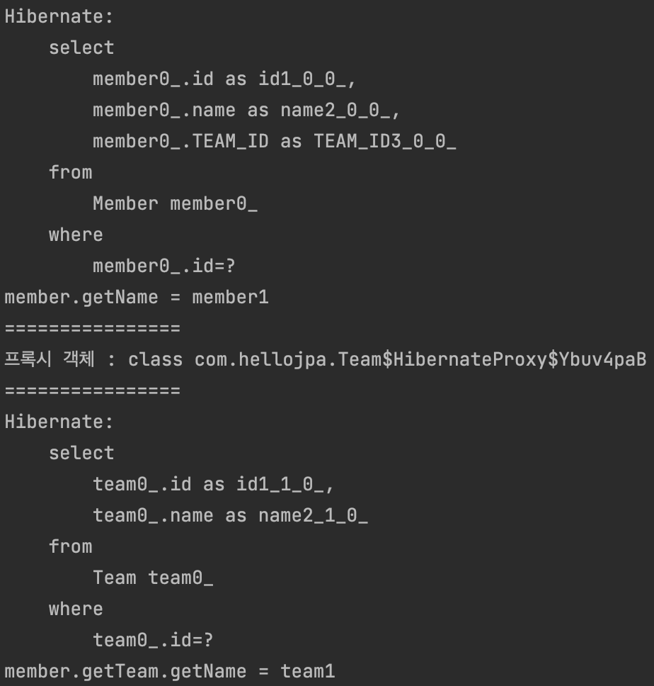 이때, 헷갈리면 안되는 부분있다. team을 조회하는 쿼리를 날리는 시점은 member에서 getTeam() 메소드를 호출하는 시점이 아니라는 점이다. getTeam() 메소드를 호출하는 시점에는 팀을 조회하는 대신에 조회한 회원의 team 필드(멤버변수)에 프록시 객체를 넣어두게 되고, getName()으로 team 객체를 건드렸을 때 비로소 team을 조회하는 쿼리를 날려서