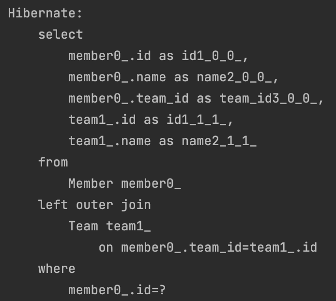 지연 로딩으로 member만 조회하고 team을 조회하지 않았기 때문에 member를 조회하는 쿼리만 날아가는 걸 볼 수 있다. 그럼 이번에는 team 객체도 조회해보자.