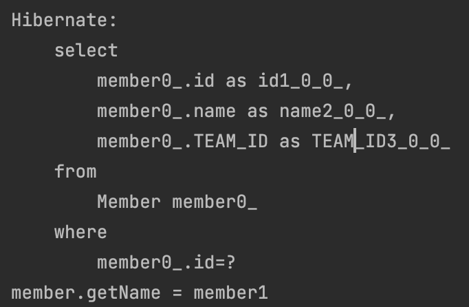System.out.println("member.getTeam.getName = " + team.getName()); // 실제 객체 조회 후 반환