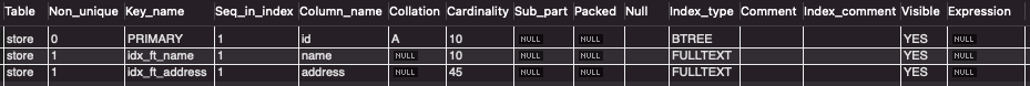 ALTER TALBE store ADD FULLTEXT INDEX idx_ft_address (address);