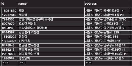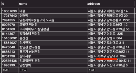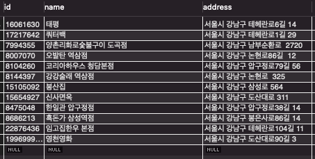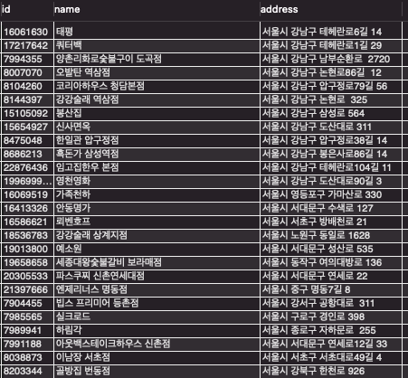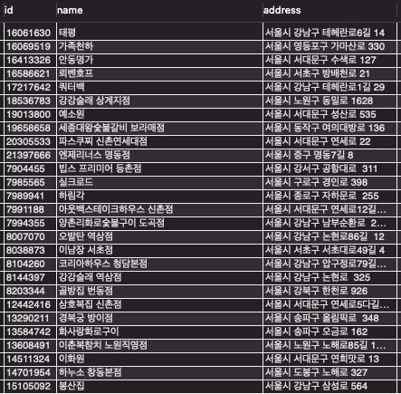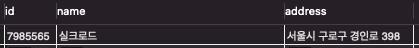 name 컬럼으로 검색하는 건 검색 결과가 적으므로 이번에는 address 컬럼을 이용해서 검색을 해보자
