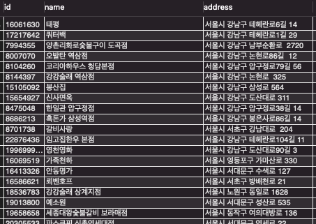 ‘서울시 강남구'가 포함된 문자열이 잘 검색된 걸 확인할 수 있다.