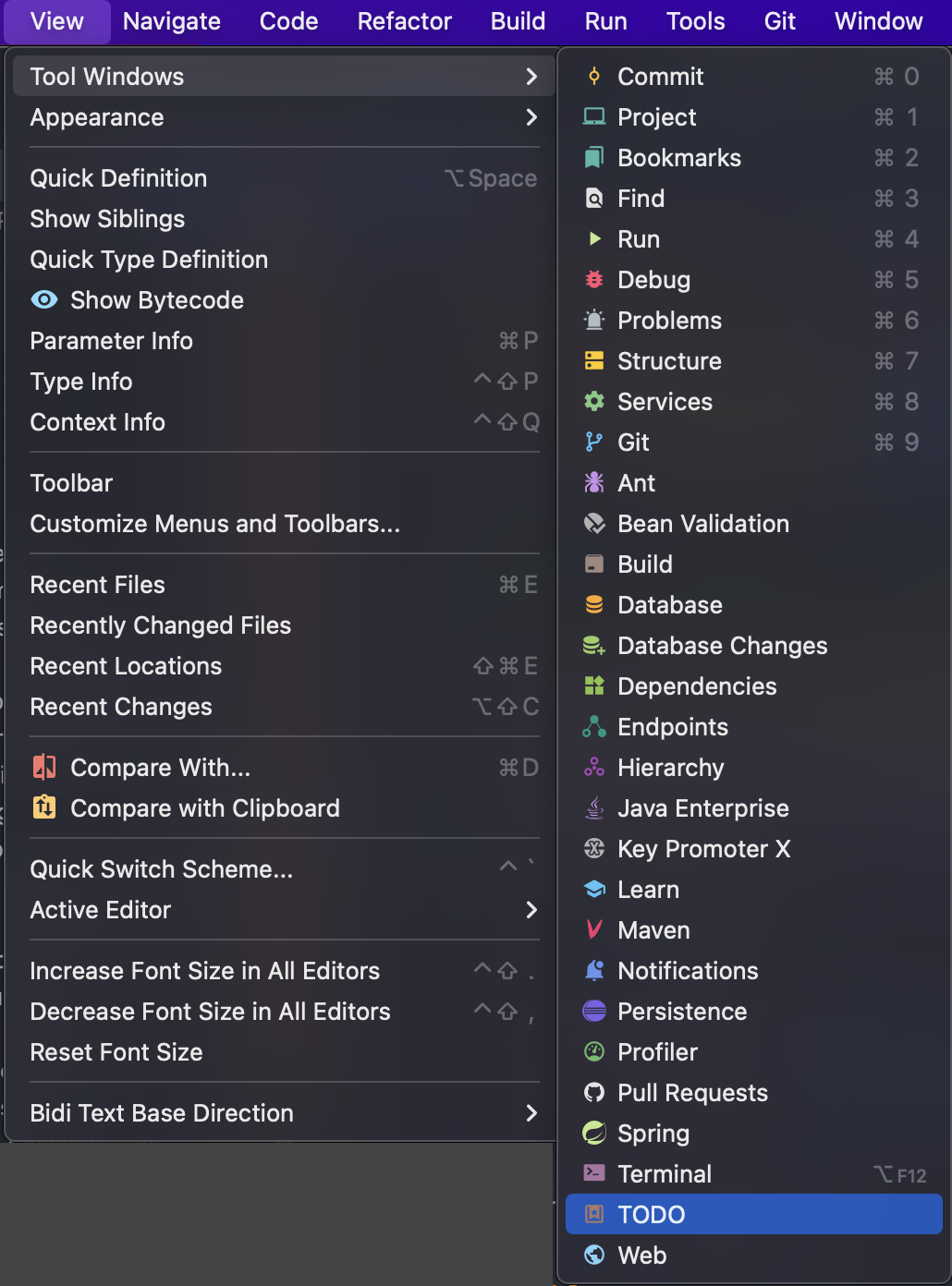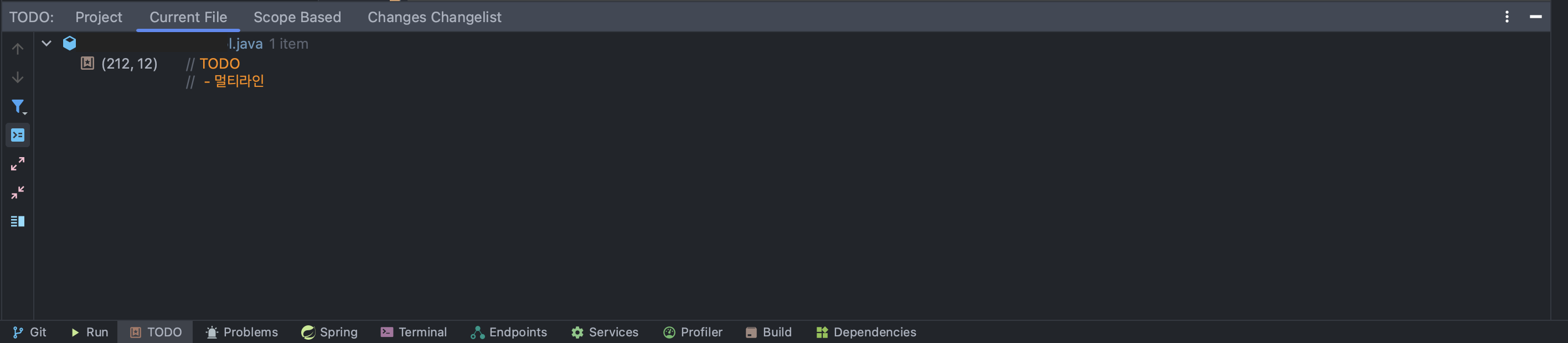 Intellij에서 제공하는 테마를 살짝 손봐서 주석 색상을 변경하는 방법도 있고, Javadoc 주석(/** content */)을 사용는 방법도 있 지만 Intellij 자체에서 주석을 모아보는 TODO 기능이 존재한다.