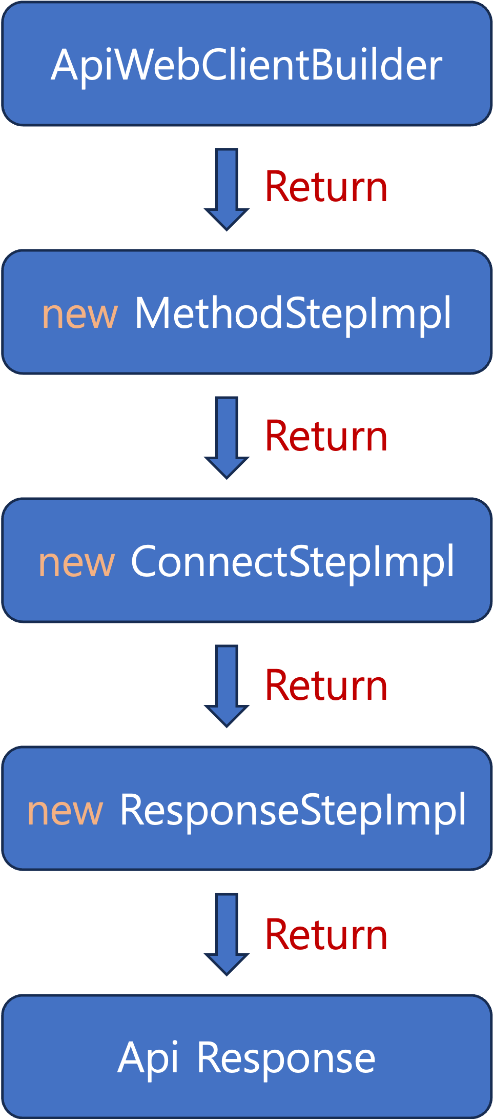 메서드 체이닝은 각 체이닝 단계별로 Interface와 구현체를 만들고, 순차적으로 다음 단계의 구현체를 리턴하는 방식으로 구현된다.