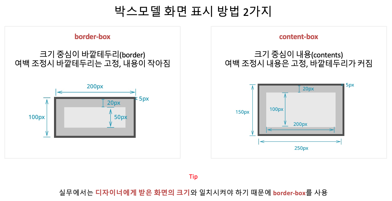 border-box는 위의 박스모델에서 border의 크기를 고정하고, content-box는 content의 크기를 고정한다.