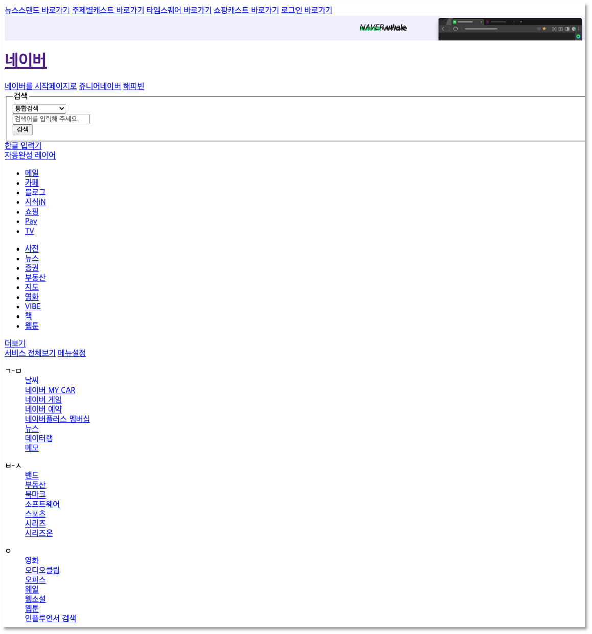 CSS가 빠지고 HTML로만 이루어진 네이버 브라우저는 이렇게 생겼다.