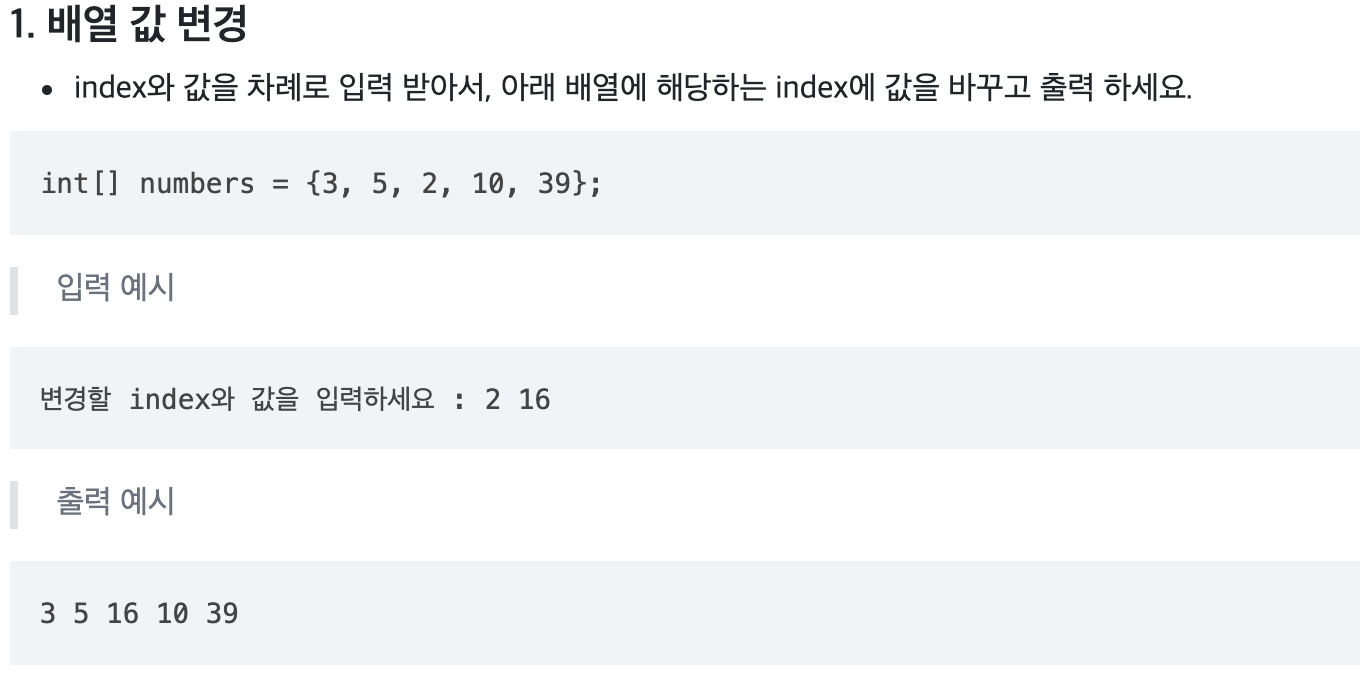 System.out.print("변경할 index와 값을 입력하세요 : ");
