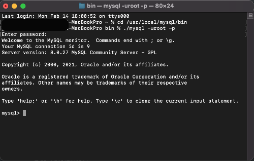 MySQL의 bin 디렉토리로 이동(Mac) >