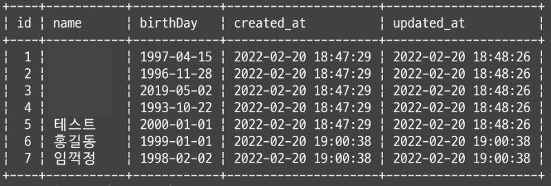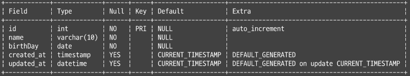 created_at 컬럼은 생성 시 자동으로 생성일과 시간이 저장되고 updated_at 컬럼은 생성 시 자동으로 날짜와 시간이 기록되는 것과 더불어 테이블이 UPDATE될 때 수정된 시간이 저장된다.