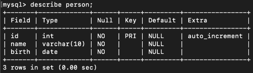 성공적으로 테이블이 추가된 것을 DESCRIBE 명령문으로 확인할 수 있다.