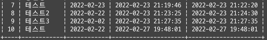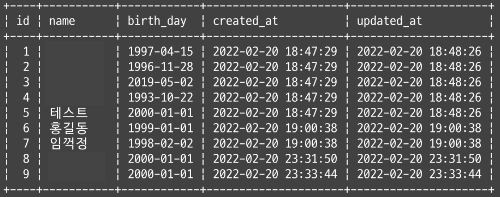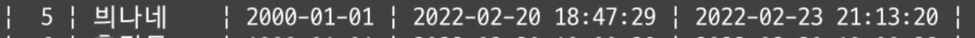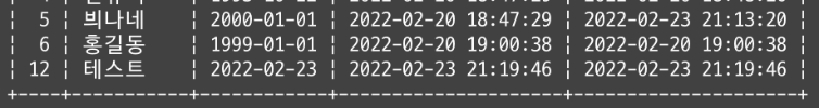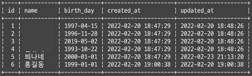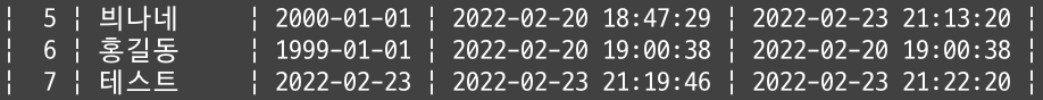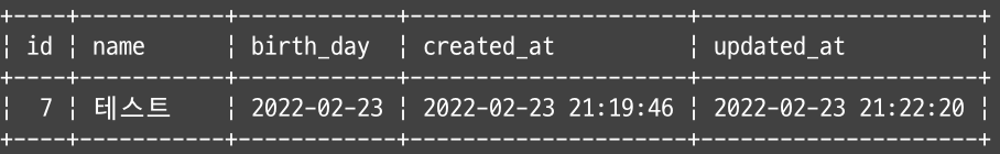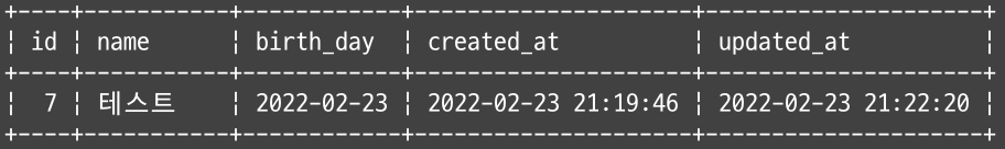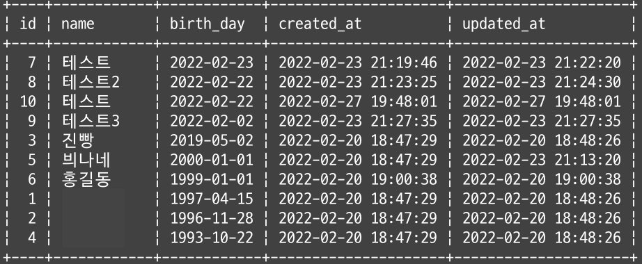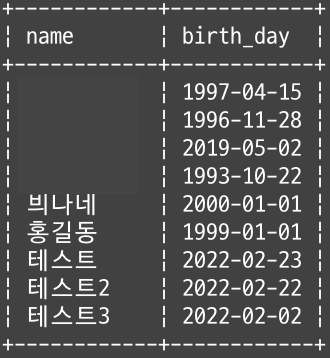 birth_day가 2022-02-23인 데이터는 id가 7인 데이터밖에 없었으므로 같은 결과가 출력된다.
