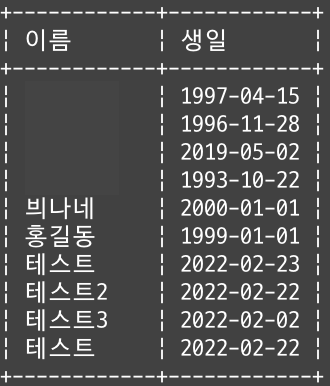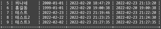 name = '테스트2', birth_day = '2022-02-02'와 name = '테스트3', birth_day = '2022-02-02' 추가