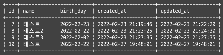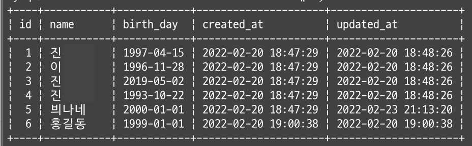 결과와 같이 이름이 '테'로 시작하는 데이터들이 조회되었다.