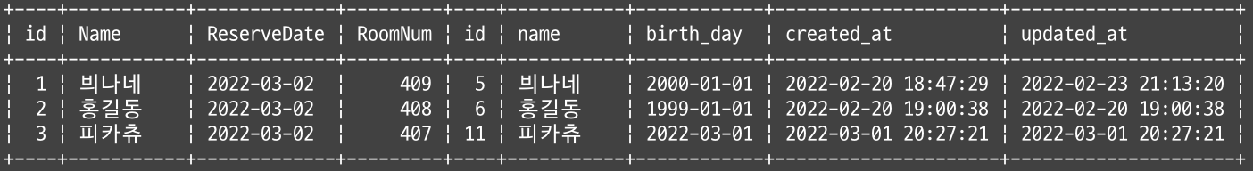 SELECT user.id, user.name, Reservation.id, Reservation.Name, Reservation.ReserveDate, Reservation.RoomNum