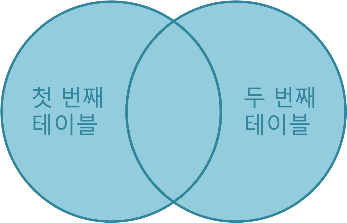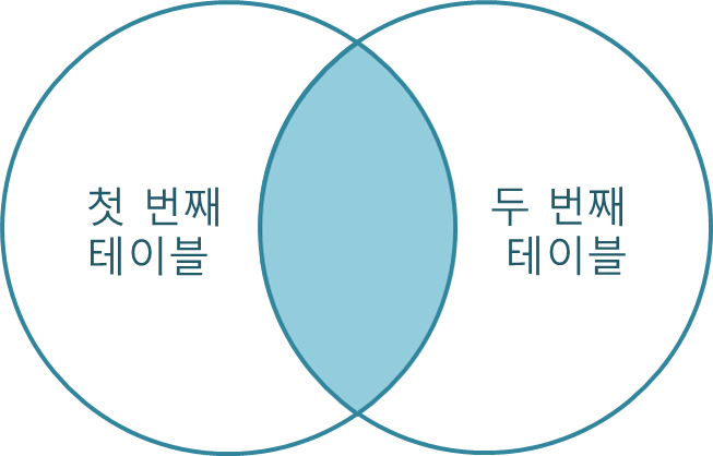 첫번째 테이블과 두번째 테이블을 조건에 맞는 값끼리 합친다 (교집합) 라고 생각하면 이해하기 쉬울거같은데, INNER JOIN문의 결과를 벤다이어그램으로 나타내면 이러하다.