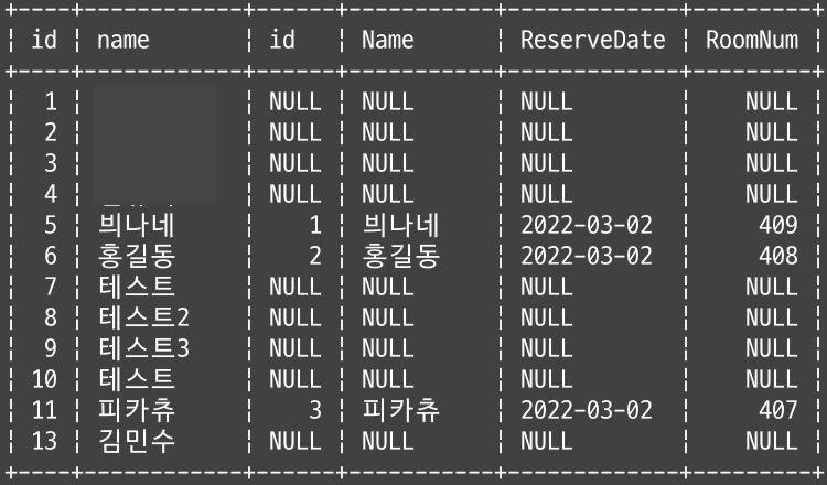 Reservation 테이블과 user테이블의 Name(name) 컬럼이 같은 경우 INNER JOIN문을 실행하였다.