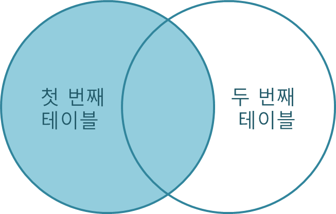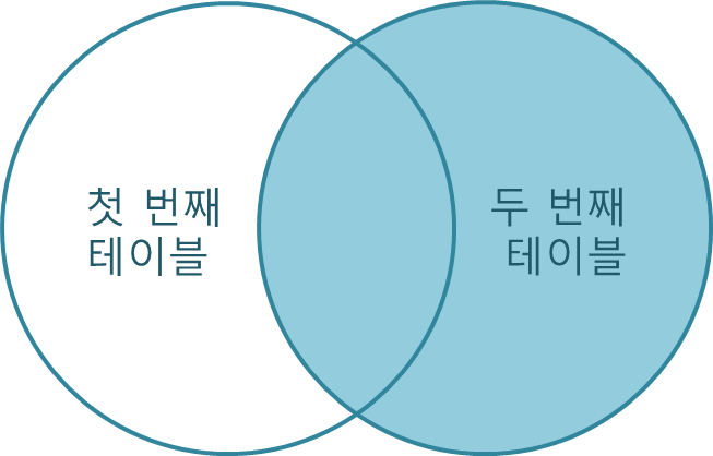 LEFT와 RIGHT JOIN은 기준이 되는 테이블 + 기준테이블 ∩(교집합) 다른테이블의 값을 보여주는데 글씨로 보면 이해가 잘 안되니 이번에도 벤다이어그램으로 보자